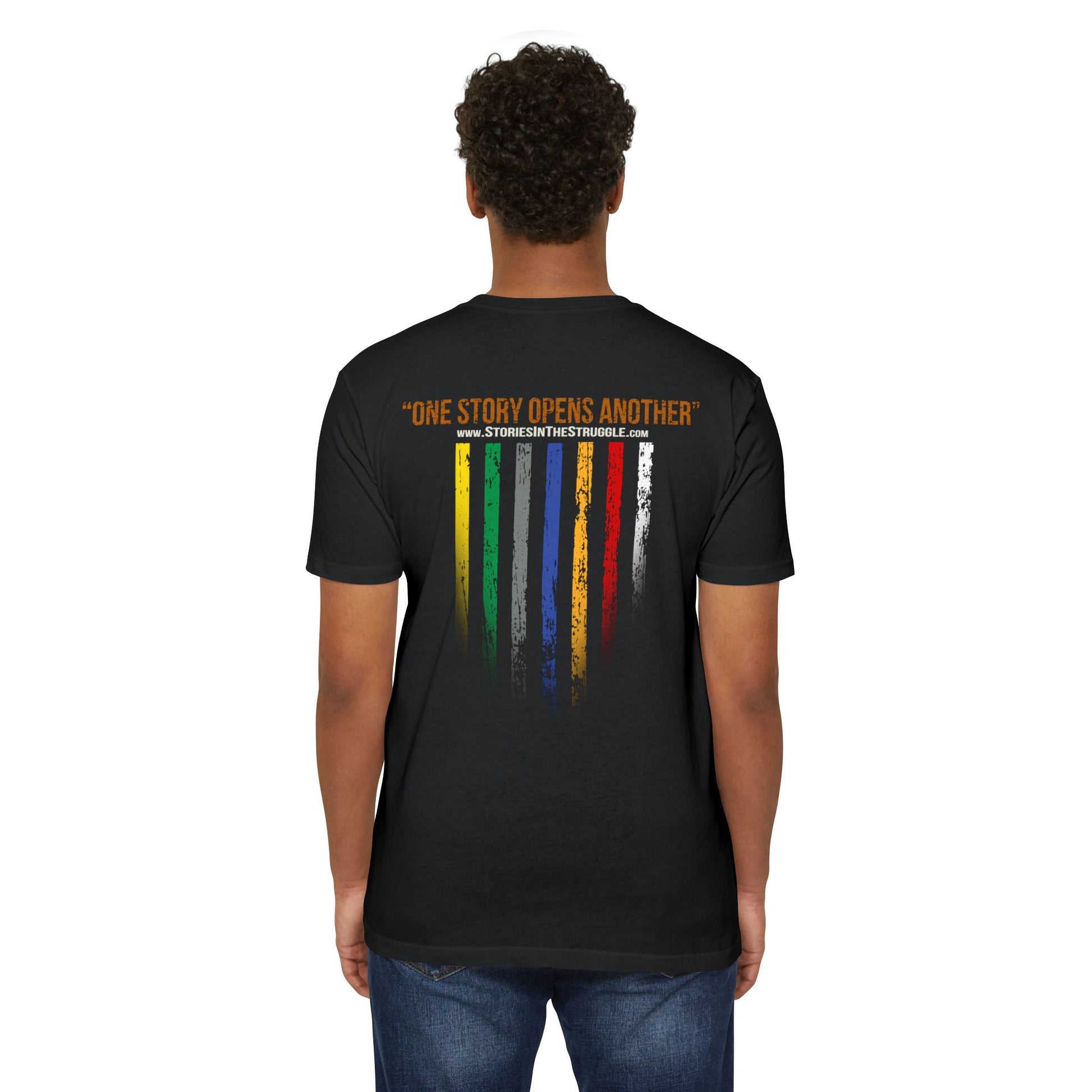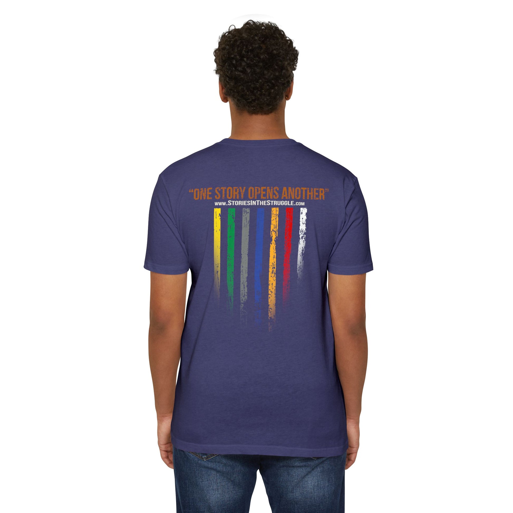 Wear your resilience. This classic-fit tee carries a quiet, worn-in look with bold lettering that reads “STORIES IN THE STRUGGLE” across the chest and a small, reflective tagline on the upper back: “One story opens another.” The faded, distressed print and heartbeat waveform detail give it a lived-in, grassroots vibe — the kind of shirt you reach for after a long day when you want to feel seen but grounded. Lightweight and soft, it layers easily under jackets or stands alone during warm evenings. It’s made to move with you through late-night conversations, support-group meetups, open-mic nights, or slow coffee shop mornings where you trade stories and find connection.