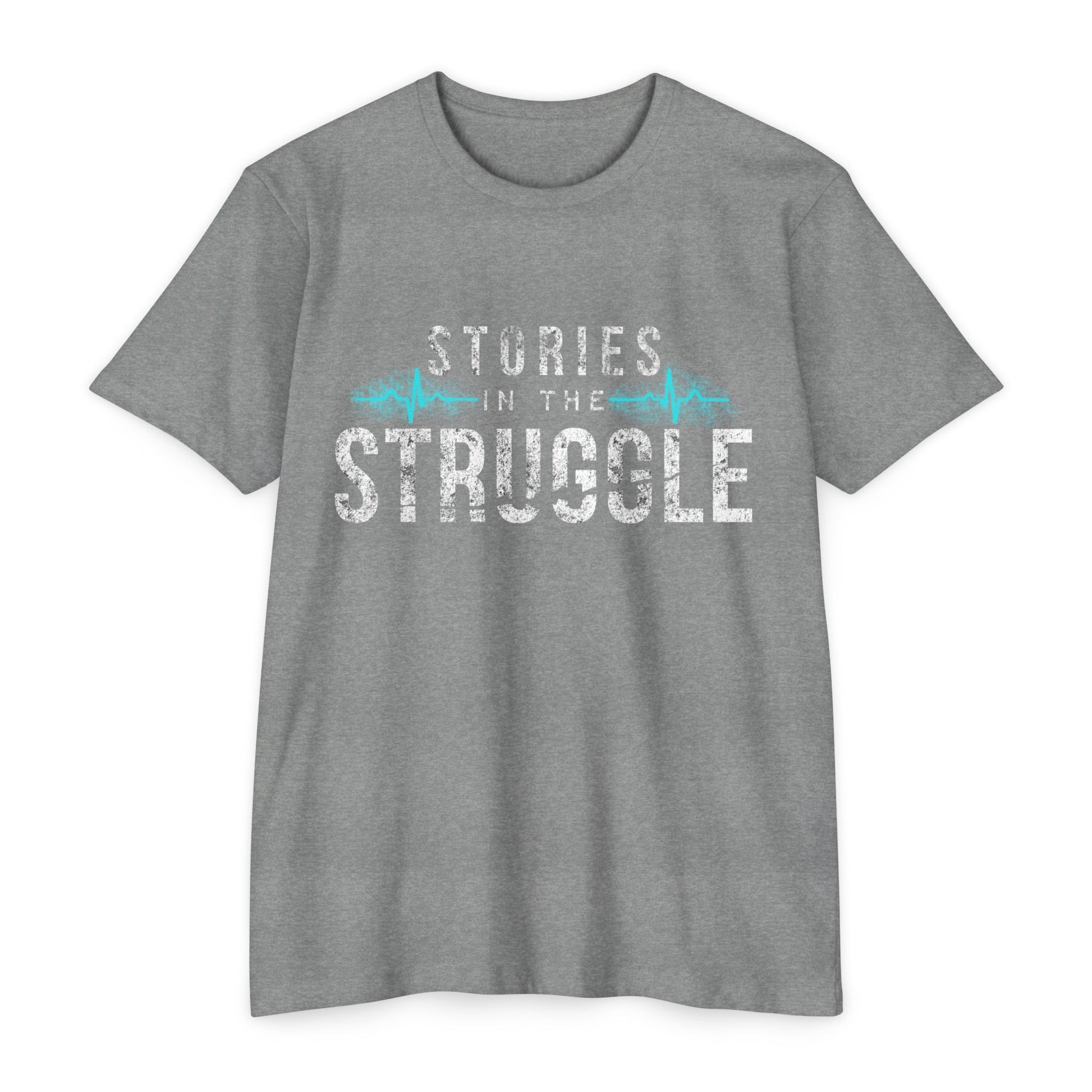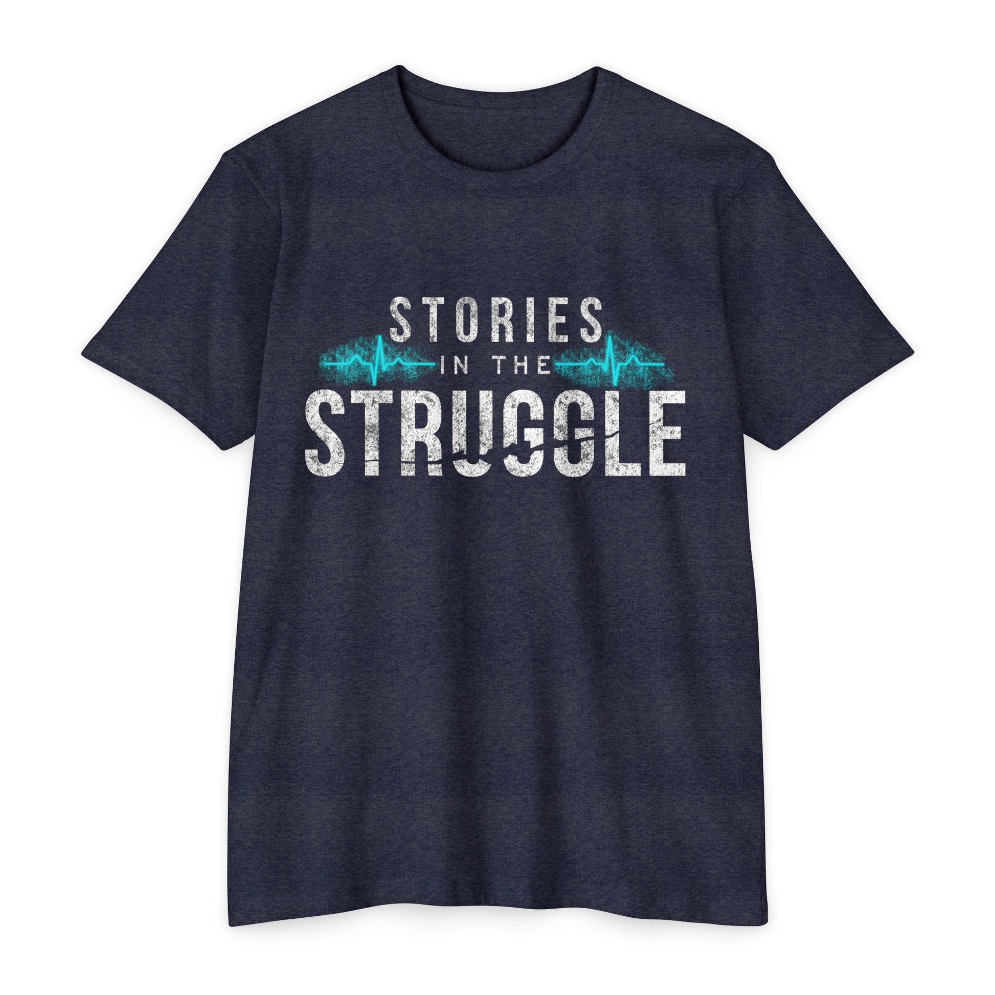 This classic tee carries quiet strength. A soft, light-weight jersey with a worn, distressed graphic that reads 'Stories of the Struggle' punctuated by a pulse-line accent. It sits comfortably on the shoulders and drapes casually—made to be lived in. Wear it when you need a steady reminder of resilience: during long shifts, late-night study sessions, post-run cooldowns, or around friends who know your story. The muted heather backdrop and slightly weathered print give it lived-in character without shouting for attention. It’s for people who collect small victories and appreciate clothing that moves with them—breathable, gentle on the skin, and built to hold up to frequent wear and washes.